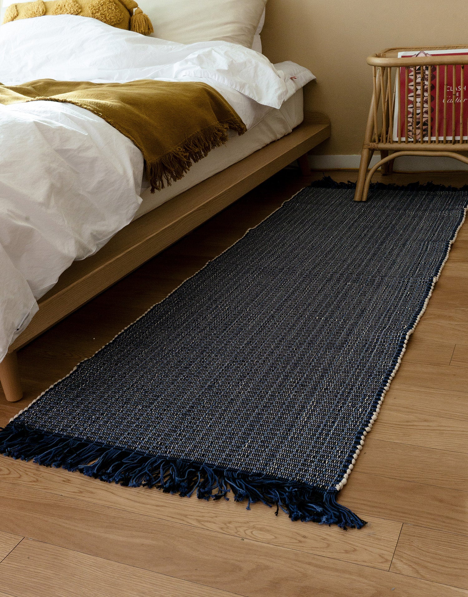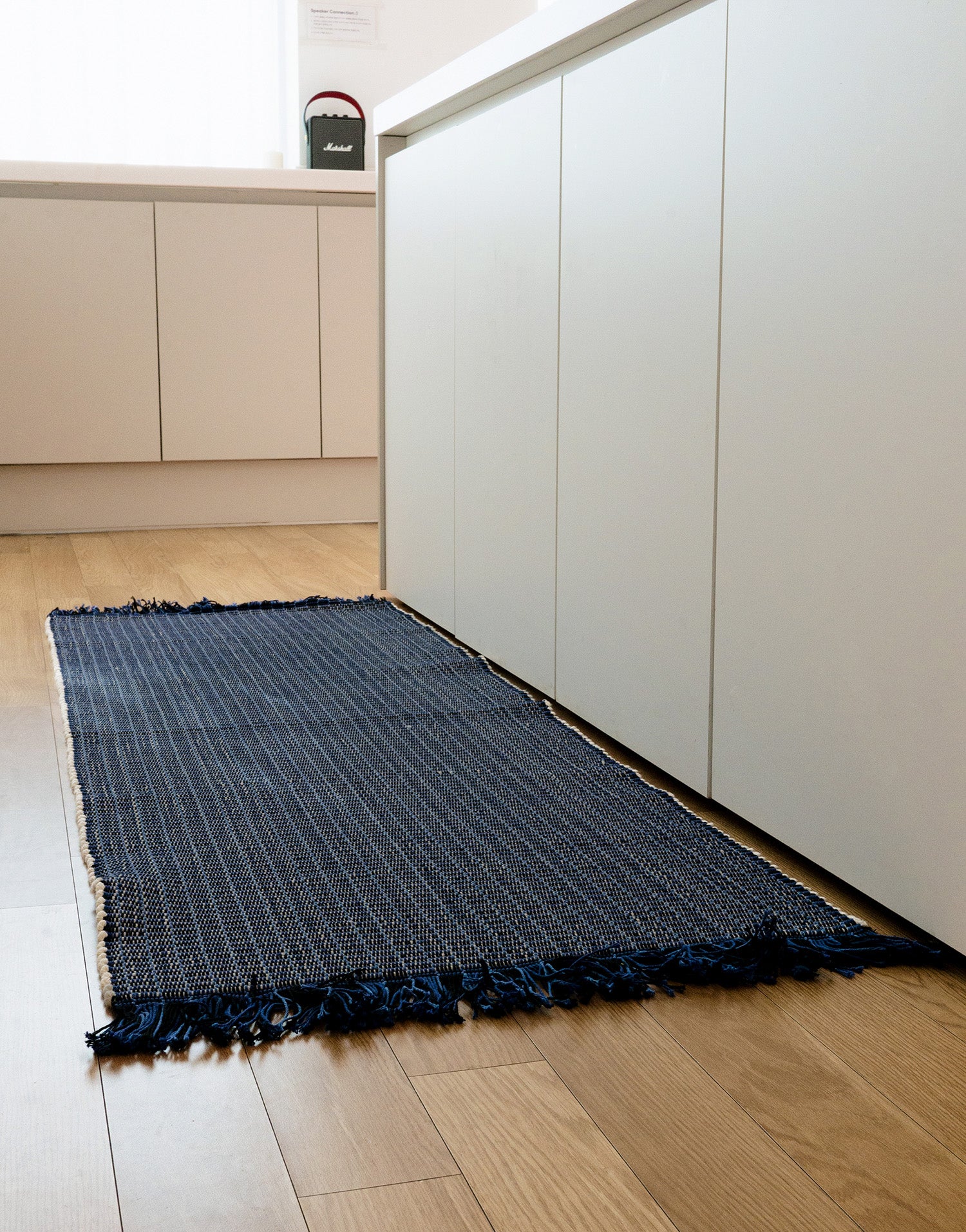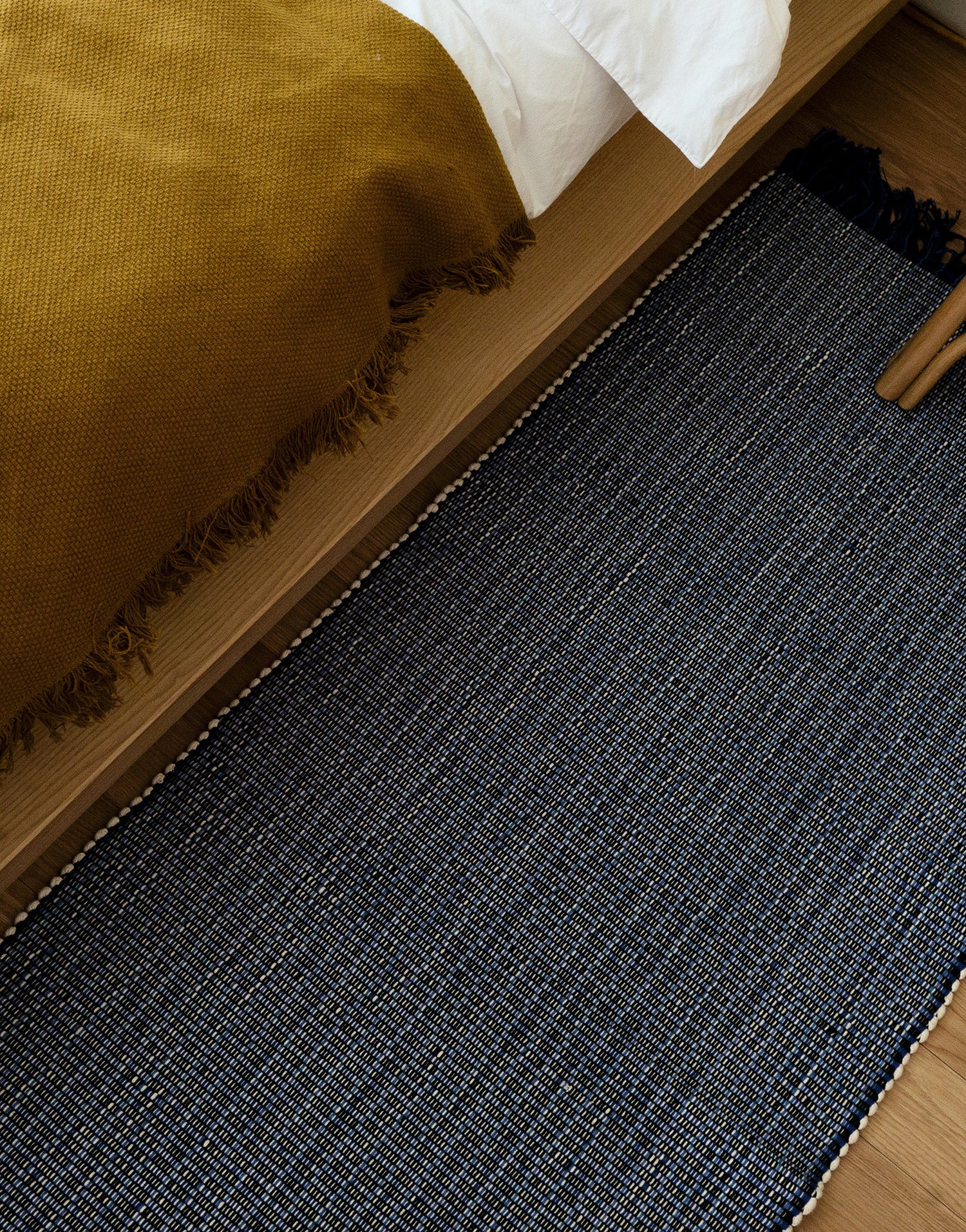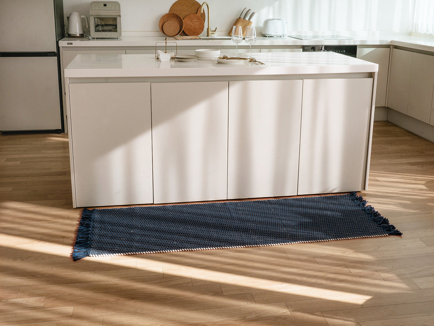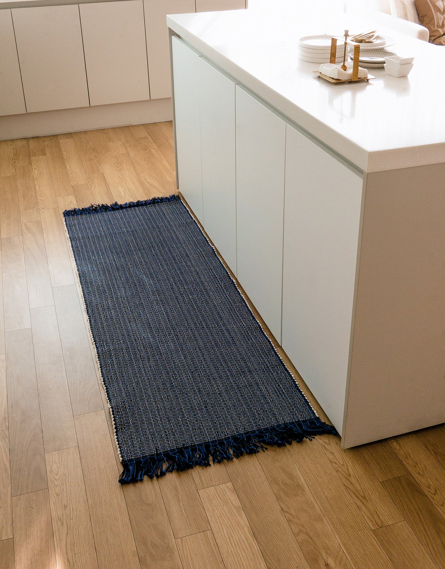 100년 이상의 핸드메이드 정신을 계승한 미국의 가족이 만든 러너 러그는 모노크롬으로 보이지만 블루 블랙 오이스터 면사의 컬러감이 매우 우아하며 어떠한 공간에도 스며들어 툭하고 펼치면 공간 포인트를 만드는데 어렵지 않습니다. 이 러그는 양면을 사용할 수 있으며 얇은 러그지만 들뜨거나 구겨지지 않는 우븐 러그입니다. 프린지는 원하는 길이로 자를 수 있습니다.