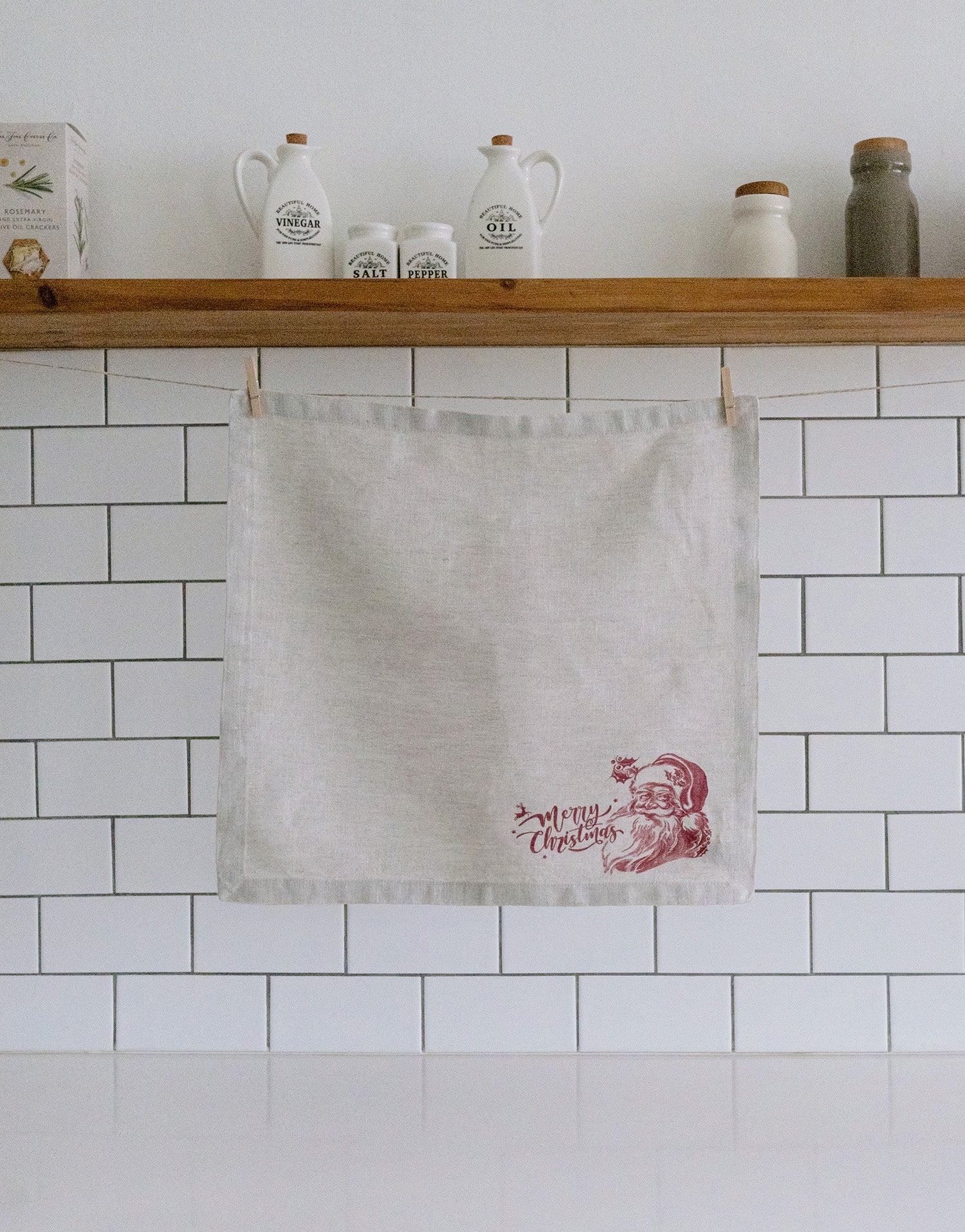 산타의 넉넉한 미소가 이 프린트 리넨 냅킨을 연상시킵니다. 오트밀 색상의 리넨과 프린트는 대단히 조화로운 디자인을 보여주고 있습니다.