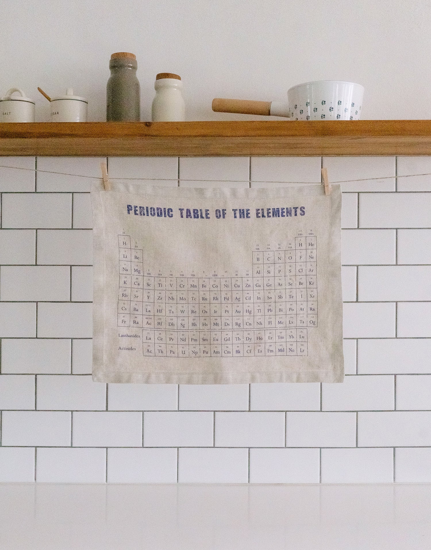 주기율표 플레이스 매트입니다. 빈티지한 타이포그래피와 그래픽이 오트밀 리넨 컬러와 완벽하게 어울립니다.