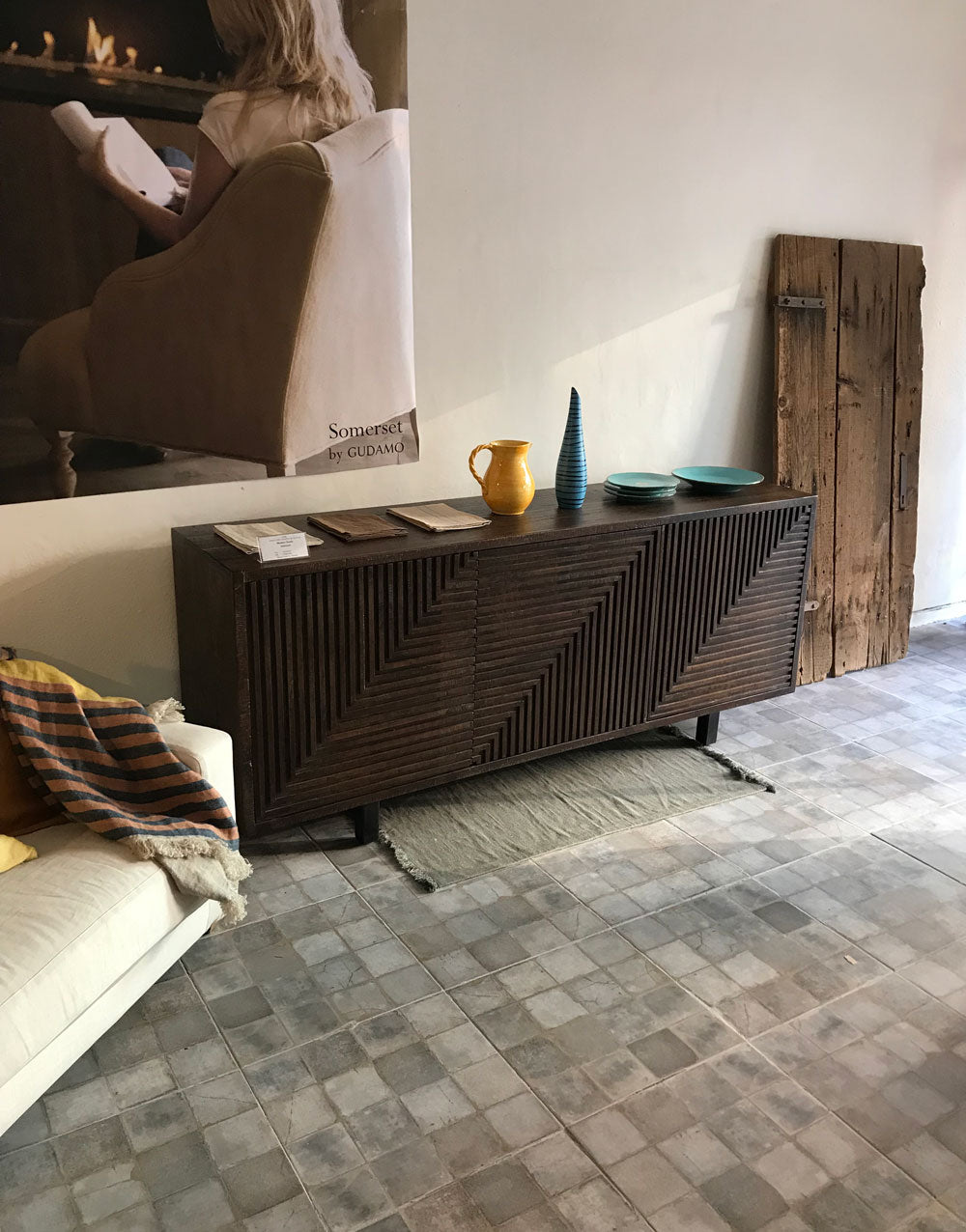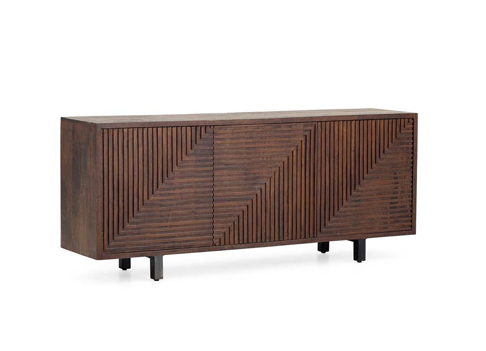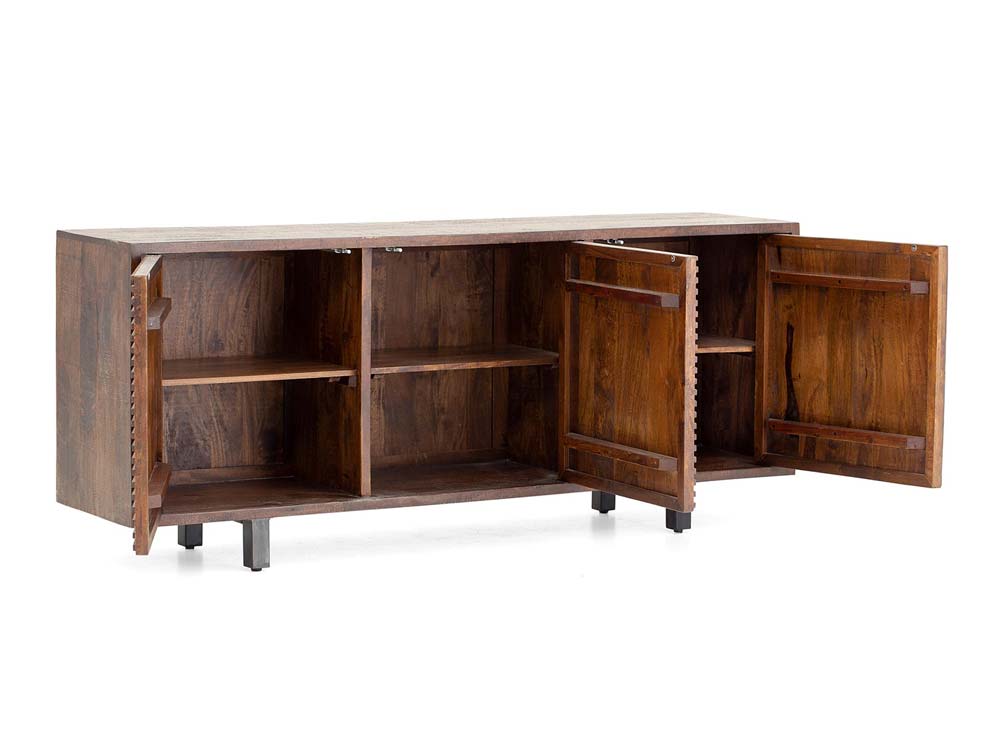 주방에서는 디너웨어를 보관 전시하고 거실에서는 장식품과 생활용품을 보관하고 방에서는 옷과 침실 용품을 넣어두는 사이드보드입니다. 와인바 공간의 구역을 설정해주기도 하며 대형 콘솔로도 손색이 없습니다. 나무 조각을 하나하나 부착하여 갤러리에 전시된 조형물을 연상시키며 시선을 사로잡는 흔치않은 디자인입니다. 오래된 건축물에서 나온 기둥이나 문에서 나온 망고 우드로 제작한 운치있는 나무의 질감이 돋보이는 모던 러스틱 스타일입니다. 도어의 입체 패턴이 흥미롭고 브라운 톤의 깊이있는 컬러가 대단히 고급스럽게도 리싸이클 나무와 절묘하게 매치됩니다. 제품의 특성상 제품마다 나무의 결이나 칠마감, 디스트레스 정도가 다릅니다.• 사이즈: W193 D46 H82cm• 올드 망고 우드• 도어 : 원터치 자석• 친환경 자재 사용구다모의 제품 이미지는 최대한 자연광으로 촬영하여 제품의 컬러를 사실대로 표현하고 있습니다. 모니터에서 보여지는 색상은 조명의 방향,밝기,색상, 사용자 PC에 따라 실물과 다를 수 있습니다. 디자인 및 구성은 GUDAMO의 표준 제작방식에 따릅니다. 나무의 결이나 옹이와 디스트레스 마감과 색상톤은 제품마다 다르며 불량이 아닙니다.