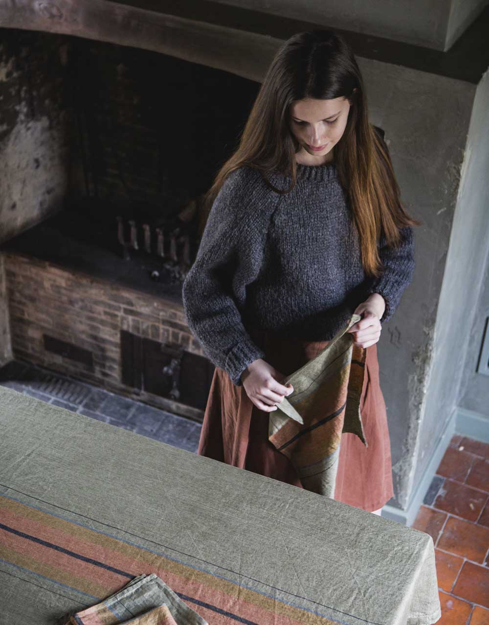 세인트 제이콥은 헤링본 직물로 올리브그린 바탕에 러스트, 블루, 블랙의 스트라이프가 올려진 풍요로운 가을 스타일입니다.